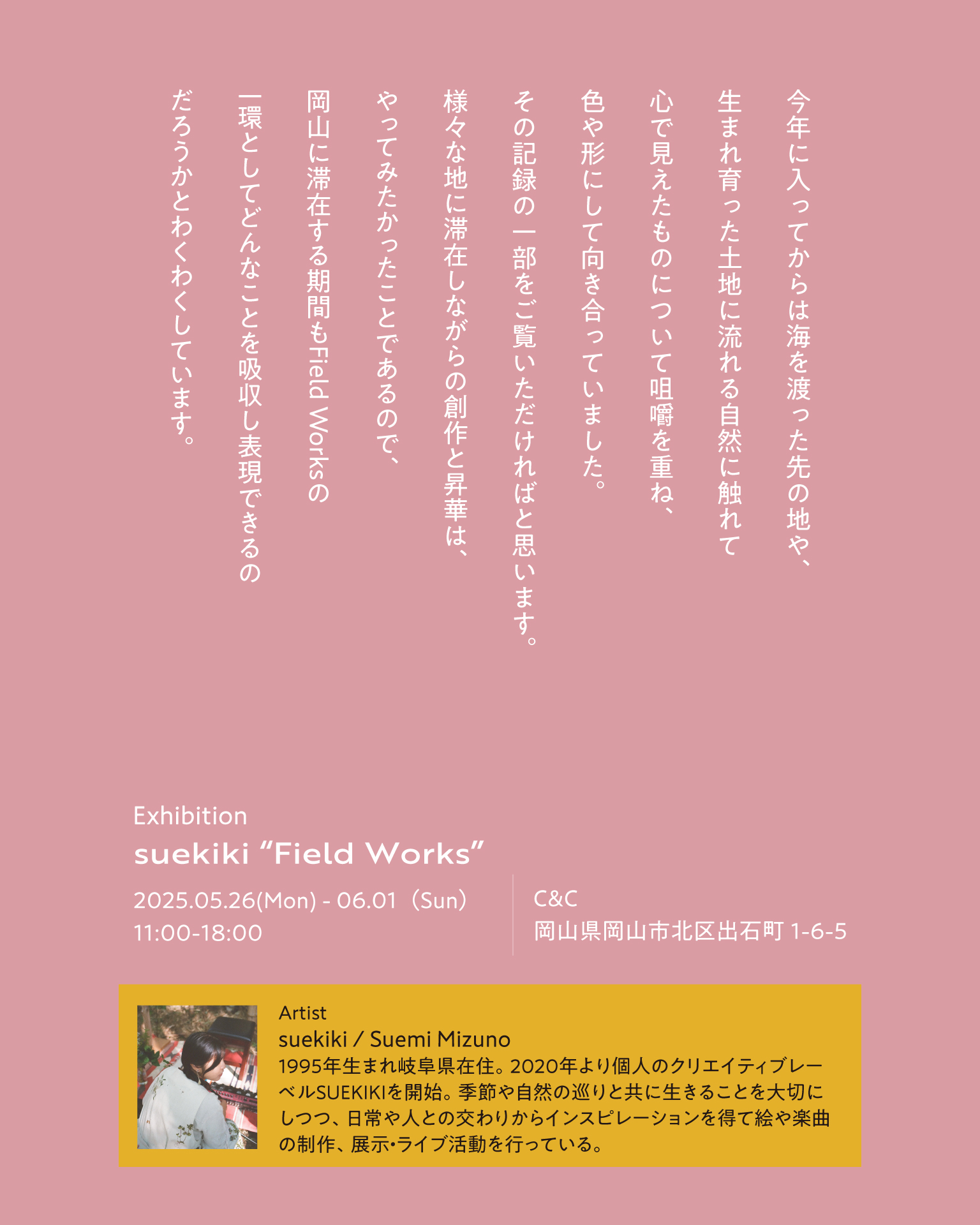 ご縁あって自身として初めて、岡山の地で展示の機会をいただきました。今年に入ってからは海を渡った先の地や、生まれ育った土地に流れる自然に触れて心で見えたものについて咀嚼を重ね、色や形にして向き合っていました。その記録の一部をご覧いただければと思います。様々な地に滞在しながらの創作と昇華は、私自身やってみたかったことであるので、C&Cさんに滞在する期間もField Worksの一環としてどんなことを吸収し表現できるのだろうかとわくわくしています。一週間、どうぞよろしくお願いいたします。